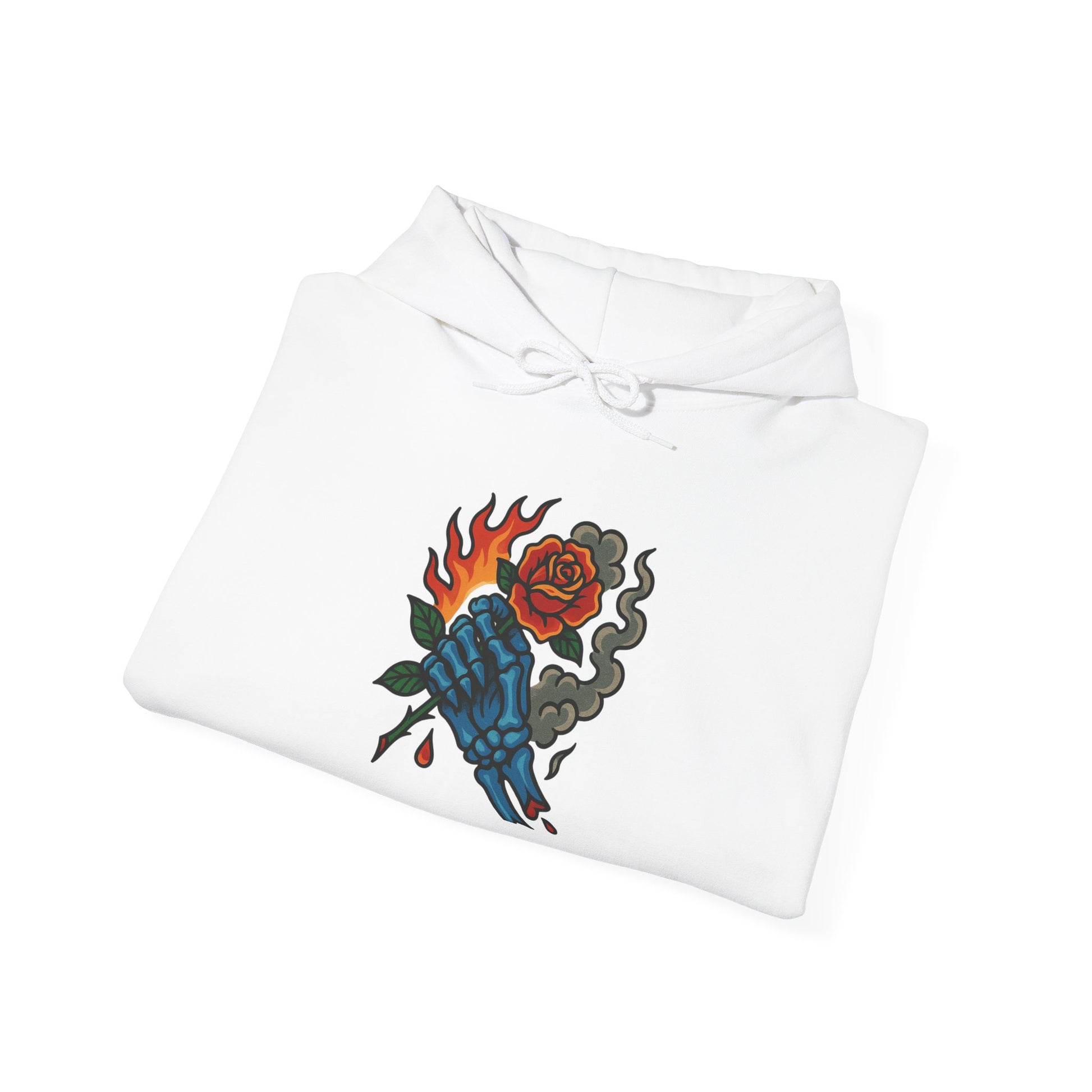 This cozy hooded sweatshirt carries a vintage botanical-rock vibe — soft white fleece serving as the canvas for bold, hand-drawn artwork. A small chest motif shows a blue bird, burning flame, smoky curl, and a single rose with a drop of blood, while the back blazes with ornate “GLORY NATURE” lettering surrounded by twin roses. One sleeve reads “ETERNAL BLOOM” in a rugged display font. The fit is relaxed and familiar, with a roomy kangaroo pouch and a double-lined hood with color-matched drawcord for extra structure. Wear it on cool mornings, at late-night shows, or whenever you want clothes that feel like a story: equal parts wild, tender, and a little defiant.