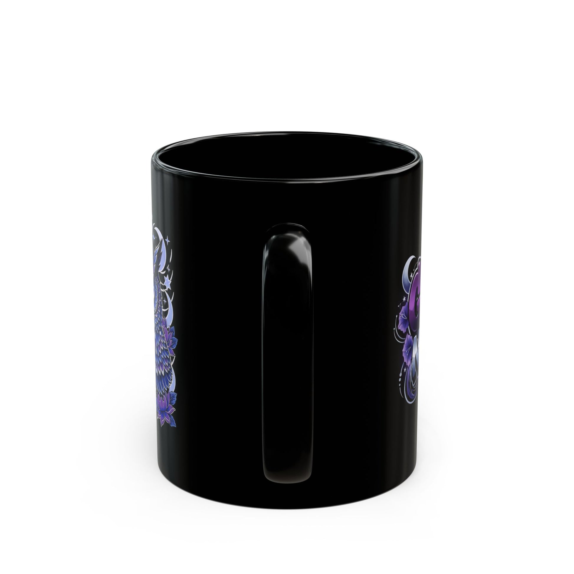 Deep midnight and inked detail meet to create a mug that feels like a small ritual. This glossy black ceramic mug showcases a jewel-toned owl illustration in electric purples and blues — intricate feathers, geometric accents, and a quietly intense gaze. It sits heavy and reassuring in your hands with a C-shaped handle, perfect for slow sips of strong coffee, tea steeped tight, or a late-night hot cocoa while sketching or journaling. The dark backdrop makes the colors pop like a private talisman on your desk or nightstand, a little piece of nocturnal calm that matches an aesthetic that’s moody, art-forward, and a touch mysterious.
