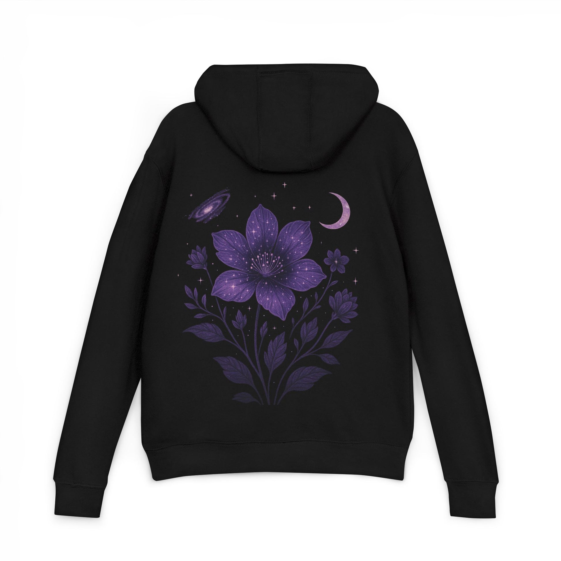 Slip into a soft, midweight hoodie that feels like a quiet night under the stars. This French terry pullover pairs a relaxed, regular fit with refined details — a three-panel, self-lined hood with dyed-to-match drawcord, double-needle topstitching, and a tidy half-moon back neck patch. The front shows a gentle handwritten logo while the back blooms with a purple floral and crescent-moon illustration, dusted with tiny stars and a subtle galaxy motif. It wears like a cozy companion for evening walks, late-night reads, or camping trips where you want warmth without bulk. The recycled-poly blend and combed cotton face give it a soft, lived-in hand that holds its shape through regular wear, and the tear-away label keeps the neck smooth and comfortable.
